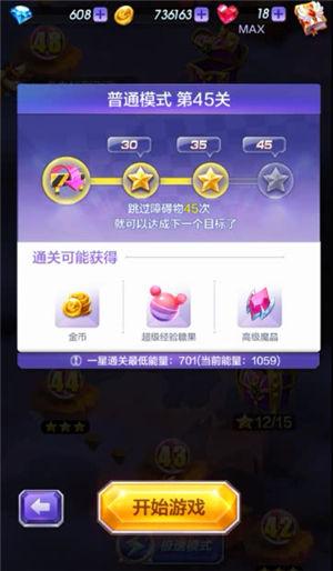 第45关卡的过关要求是跳跃一定量的障碍物,一星、二星、三星的要求数分别是30、35、45个,最低能量要求为701。所以我们在阵容上选择续航强、能量高的阵容就行了。比如保护性、高能量的疾风少年和续航能力强的焰火之灵等,需要注意的是,破坏性的角色就不要选择了,比如魔力可可、桃丽丝等,破坏性的角色可以破坏障碍物,减少我们需要跳跃的障碍物,无形中增加了本关的过关难度。
