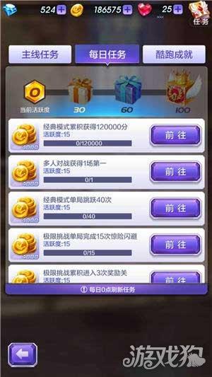在任务系统中,一共分为三种任务:主线任务、每日任务、酷跑成就,在这里需要注意一点,宝物效果只能在每日任务中触发而不能在其他的任务系统中触发。