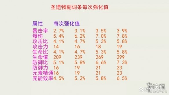 圣遗物副属性的强化属性,有暴击率、暴击伤害、攻击百分比、攻击力、生命值百分比、生命值、防御百分比、防御力、元素精通、元素充能效率等。且每次的强化值都只有4种情况,分别如下图所示。(实际情况,因为有两位以上的小数值,所以会有轻微的偏差)
