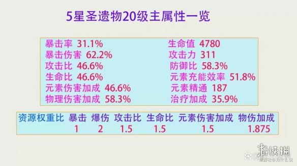 原神的各属性数值,基本都遵循着一个固定的资源权重比,对于武器、圣遗物都是如此。该权重比为暴击:爆伤:攻击百分比:生命值百分比:元素伤害加成:物伤加成=1:2:1.5:1.5:1.5:1.875;该权重比适用于圣遗物主属性、副属性、角色突破属性、武器副属性等各种情况,算是原神数值设定的一个守则。如20级圣遗物主属性的攻击百分比,拉满为46.6%,暴击率为31.1,符合暴击:攻击百分比=1:1.5。五星角色突破属性为暴击的最多加成有19.2%暴击率,为攻击百分比的则是28.8,同样符合暴击:攻击百分比=1:1.5。