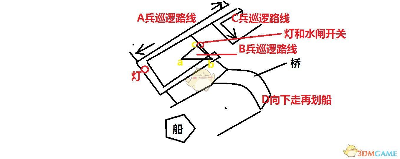 如图,划船过来后半段,D走了之后小船进去靠岸,潜行吹灭1楼小灯,然后等B兵走到c点,A兵向右走后上去吹灭两个灯并把水闸拉了,然后回船等B兵向a点走,C兵向前走或者右走划船出去,A兵低难度可以无视。最高难度下要同时满足ABC三个兵位置恰当才能划出去,否则秒被发现。
