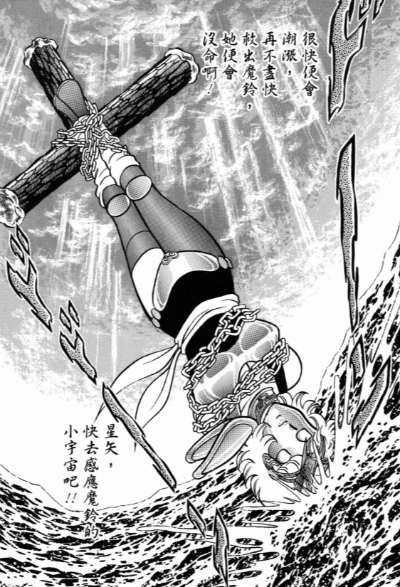 在一顿毒打之后,魔铃被倒挂在木架上,苦受海水倒灌之刑。