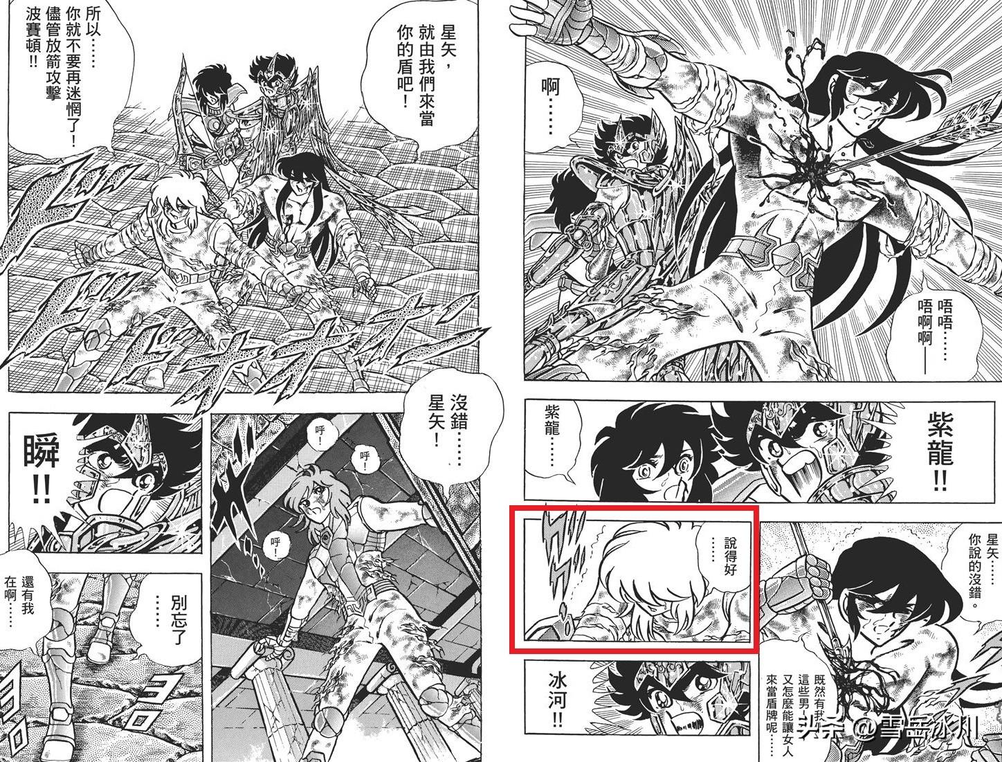 懂圣斗士的都知道、护体最厉害的不是圣衣,而是怎么都打不烂的布衣,所以圣衣经常被打个粉碎、而布衣却照样完美护体。领会到这一点就会发现紫龙是真正意义上的肉盾,裸身硬挡黄金箭,连块布料都没有。并且紫龙这一挡极大地提升了本队的士气,原本躺在地上装死的冰河发现:被黄金箭反射的裸身紫龙居然没死,那么有布衣护体的他顿时信心大增,也加入了肉盾行列,而躲在门后尚有圣衣护体的舜也终于敢大胆上前了。以前一篇《圣斗士星矢:谁才是不穿圣衣的裸拳之王?》中分析过最强裸拳为紫龙,如今最强裸盾的名号也当属于紫龙。