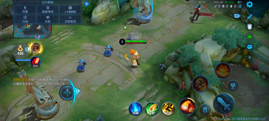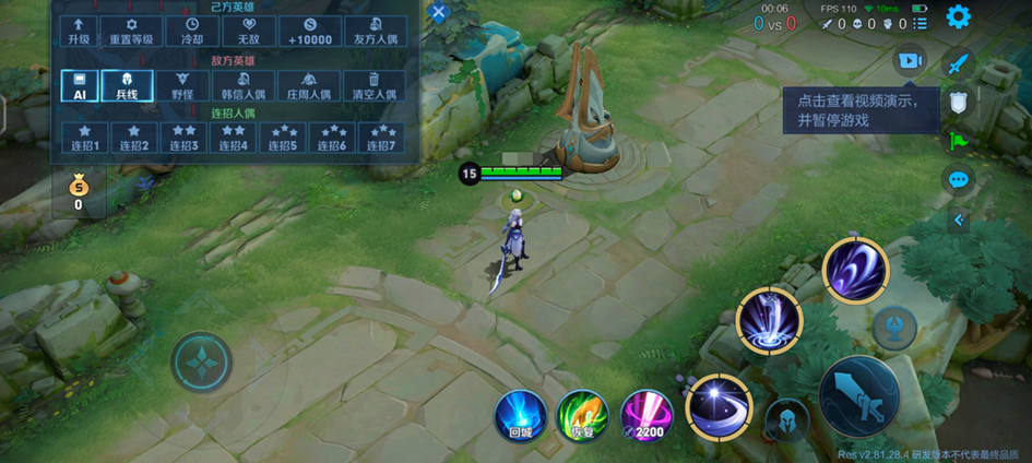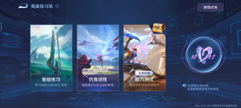 仿真训练:这个功能和5V5人机非常相似,但新增了升级、复活、无CD等开挂功能,同时在对战时会触发小技巧的提示。