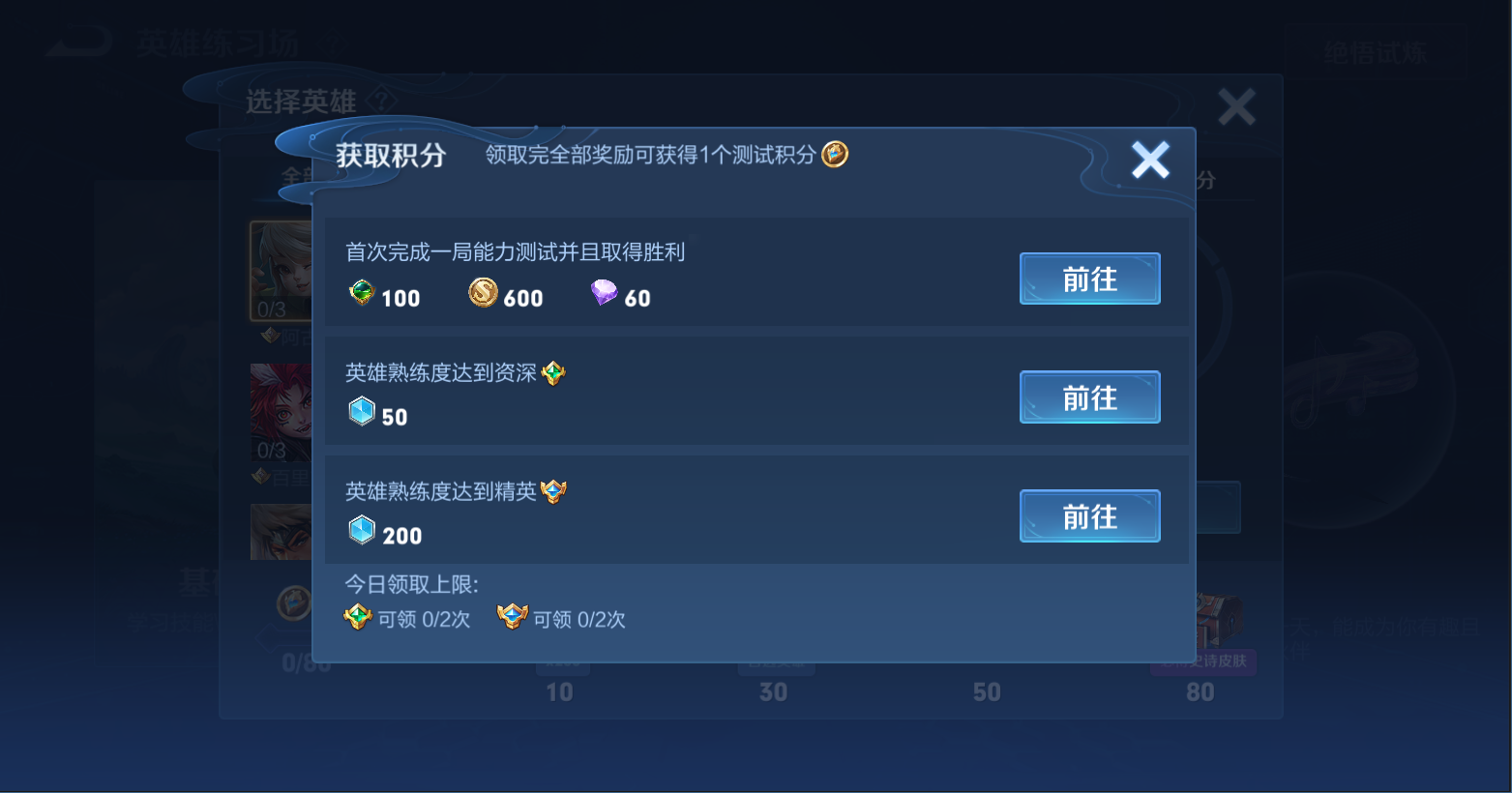 现在来说说永久英雄/史诗皮肤的奖励怎么获得?每天完成能力测试中的任务,即可获得测试积分(预计一天2个),任务非常简单但要费点时间,即英雄熟练度达到精英且通过能力测试(胜利)。