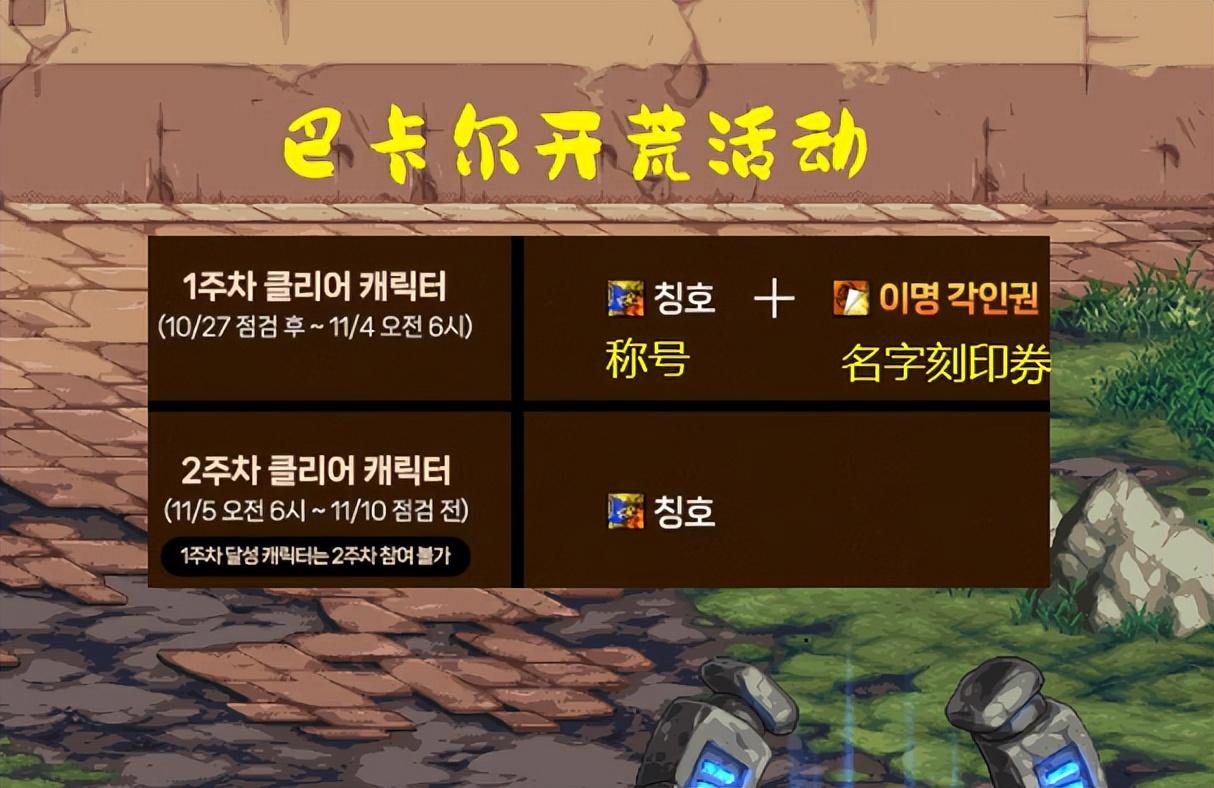活动内容大概是这样的,在巴卡尔团本推出的一个星期内,只要你能够顺利通关,那么就可以拿到一个专属称号,以及一个武器名字刻印券!