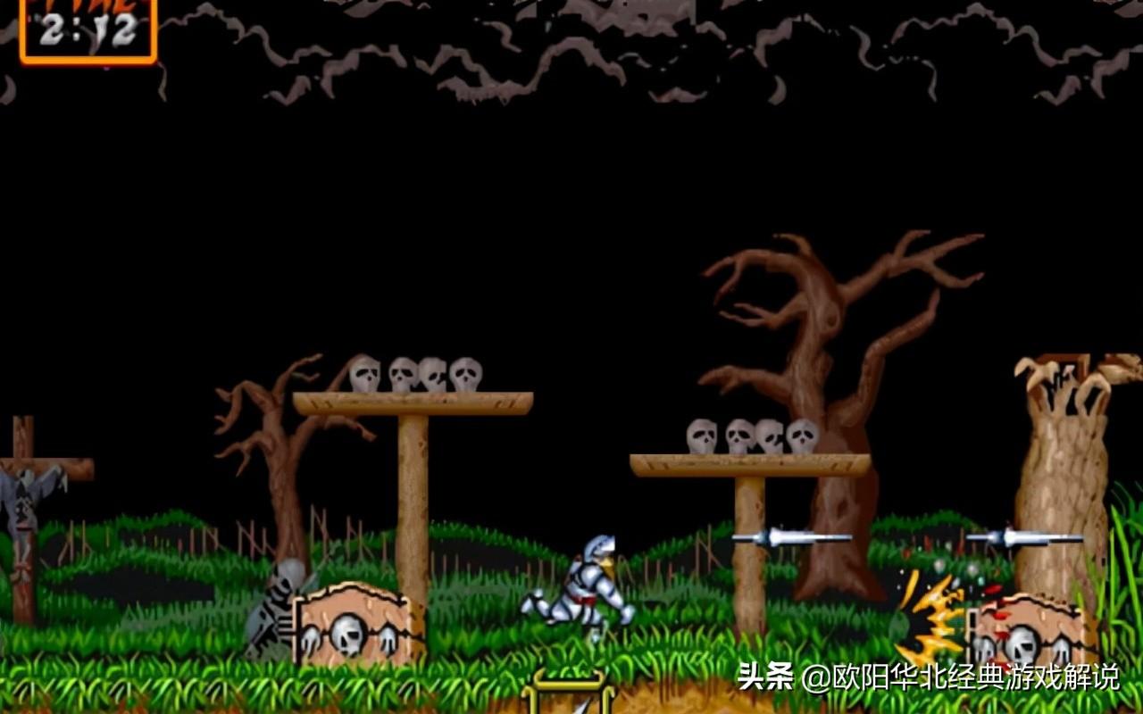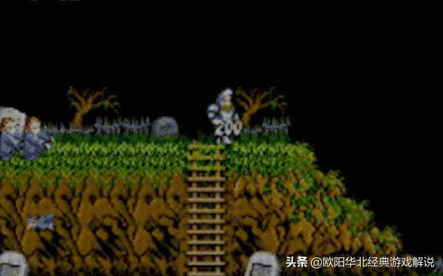 其次就是这款游戏的设定简直就是离谱,首先第一个,就是魔界村里小怪出现的位置都是随机刷新的,也就是说这个游戏你无法做出“背板”的操作,即使你打的多了也只能记住游戏里面的地形。