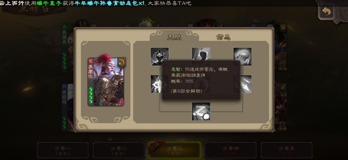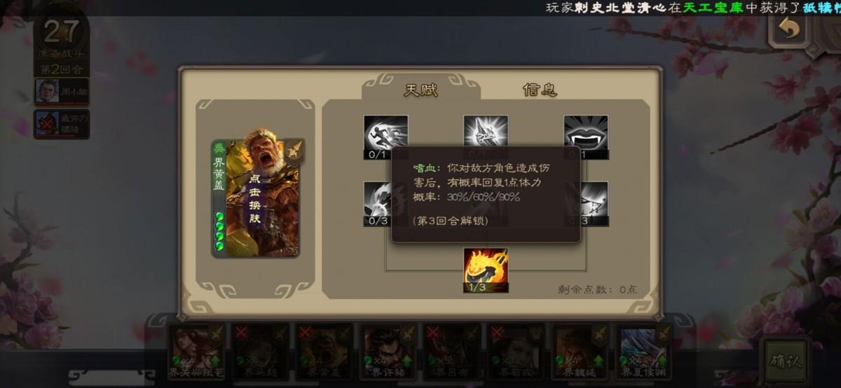 这个还真类似lol的天赋效果,根据不同的天赋加点,在游戏内武将表现的效果也不同。大致来说是三个职业有三种天赋,菜刀将的天赋都是类似于加伤吸血的,卖血将天赋就是回血免伤的,所以天赋确实和武将挺搭配的。游戏开始时武将是没有分配点的,每小轮游戏结束后所有武将就可以加点一次,加点是在本局游戏中不可取消的,所以也要留意下加错点。