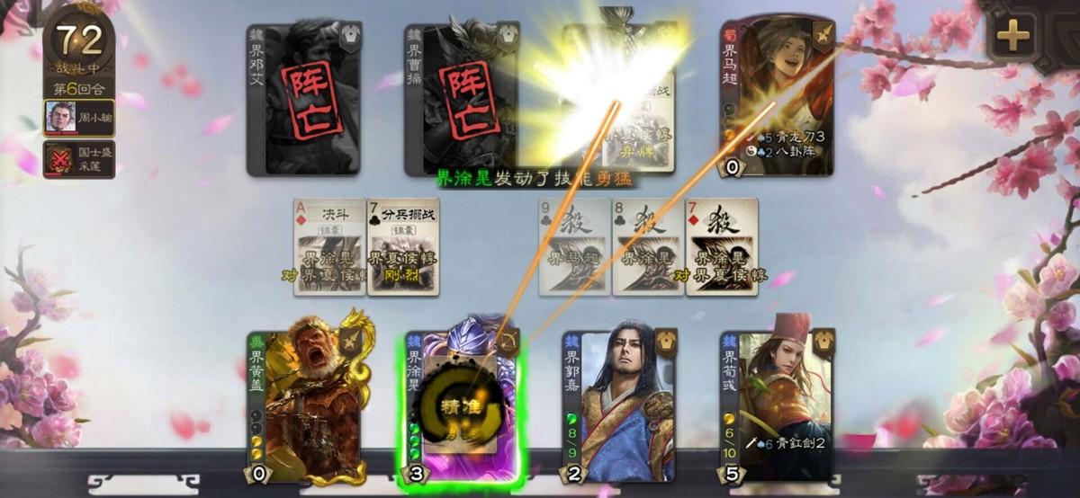 界曹丕:曹丕被定义成了刀盾兵,可以点的天赋便是增加体力上限,全部点此效果可以造成10体力上限的曹丕,而且本身也会吸引火力,这就造成了曹丕前期可以无限翻面,后期翻队友随便手中就有十几张牌。