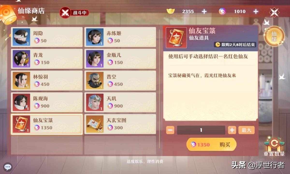 仙缘商城每周还有限购,如果购买仙友宝箓的话需要花费更多的仙缘。当然,拜帖还有其他的获取渠道,可以节省一些,但是行者还是建议平民和小氪玩家不要在这方面花费太多元宝,对实力提升并不是很明显。