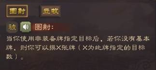 图射:当你使用非装备牌指定目标后,若你没有基本牌,则你可以摸X张牌(X为此牌指定的目标数)。