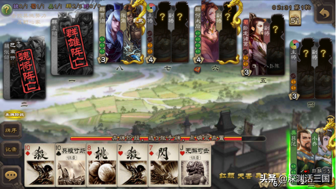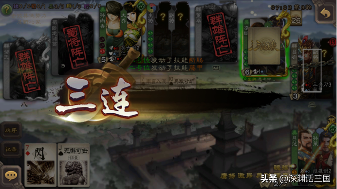 比如你一血,对方杀你一下,你出一张闪,等待对方的回合结束,你就可以把牌补至体力上限,非常强。比如这局虽然我被兵了,但是靠着典财回合外补三张牌,这个兵天不天妒已经就变得无所谓了。