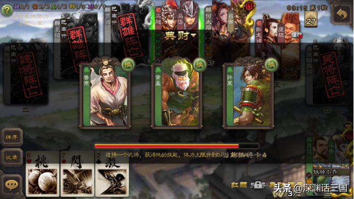 而且二技能发动之后可以给自己变更一次副将,这个技能可用可不用,如果自己副将不行,这就相当于回合内给自己升级武将,只要找到一个大乔、小乔、香香、周泰,武将组合马上就可能有质的飞跃。