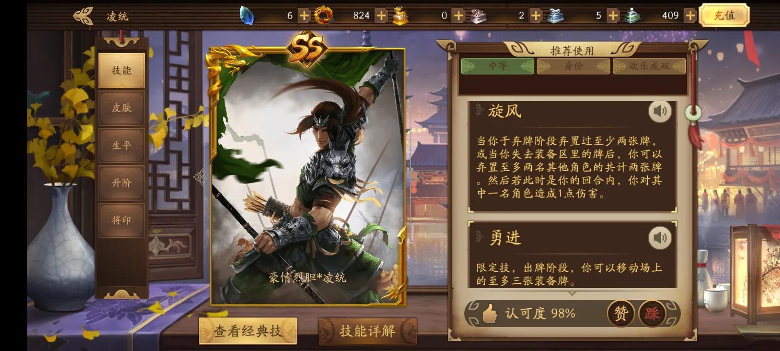 凌统技能可以迅速攒出破虏标记,勇进限定技可以留着,在有十几个二十几个破虏标记时开破虏加勇进直接秒杀敌将