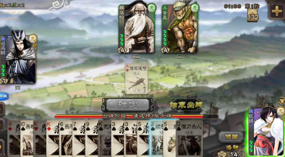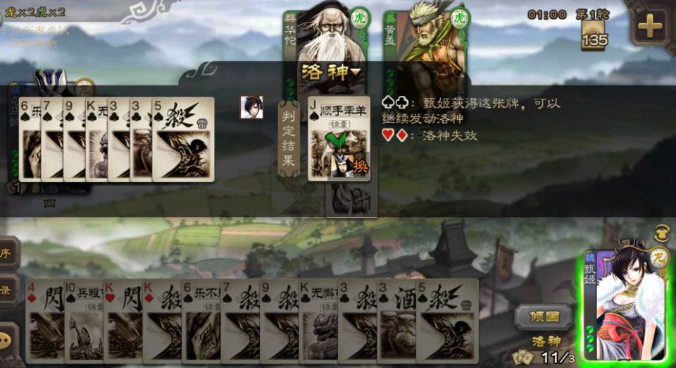 实例如图,排位赛遇见司马和甄姬的组合,刷牌真的很爽,【洛神】配【鬼才】开局刷一堆牌,可惜了最后抽到的【诸葛连弩】是红色的,不然可以直接带走一位了。对面的华佗和黄盖配合其实也不错,华佗每一次给黄盖的回血都很及时。这一场对决告诉我们,原则上,有奶先断奶,遇见华佗之类的大血库,最好先针对华佗下手。