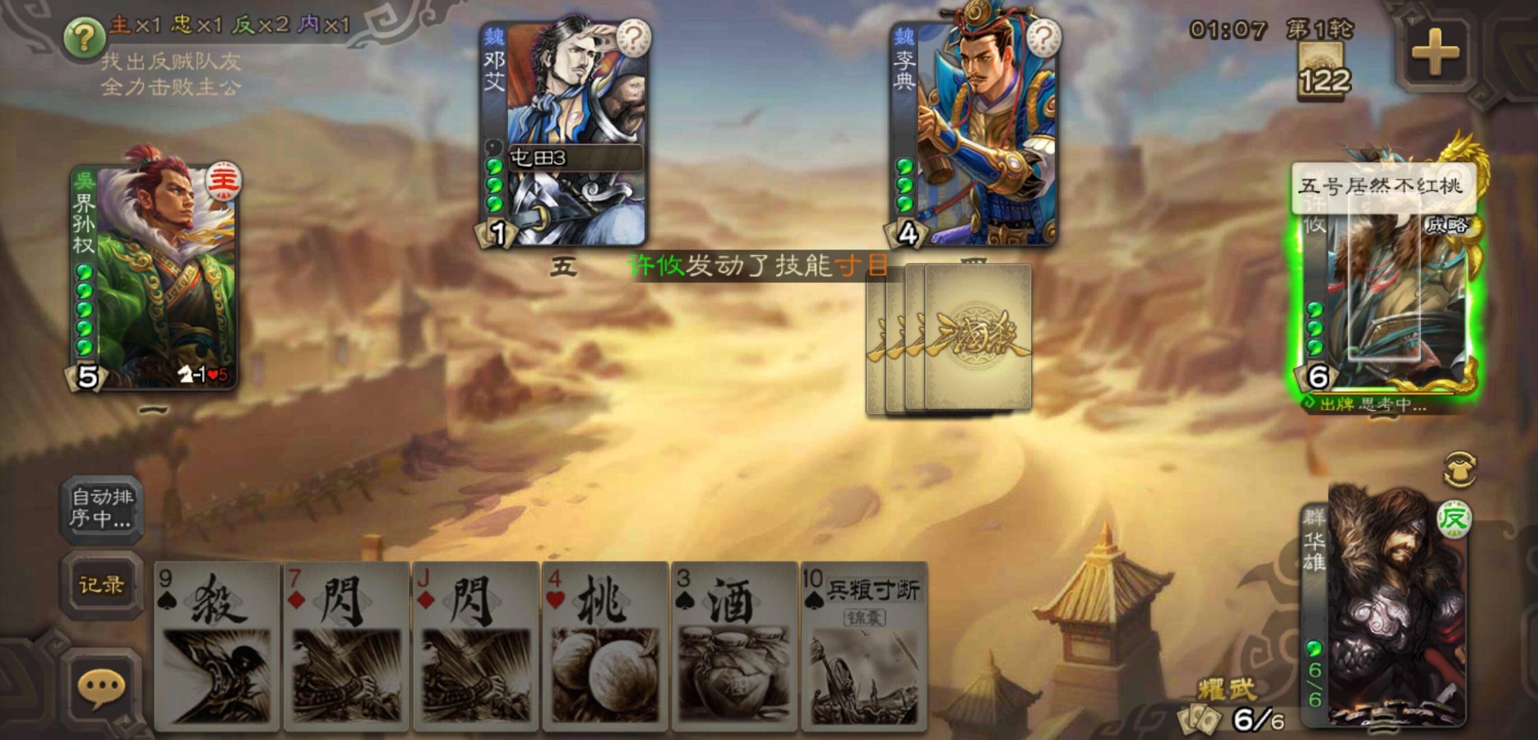 刘表因为【自守】的大过牌量和存牌量,回合外是拥有大量基本牌防御牌的。一般输出手段挺难让他掉血,打起来怪没意思的。