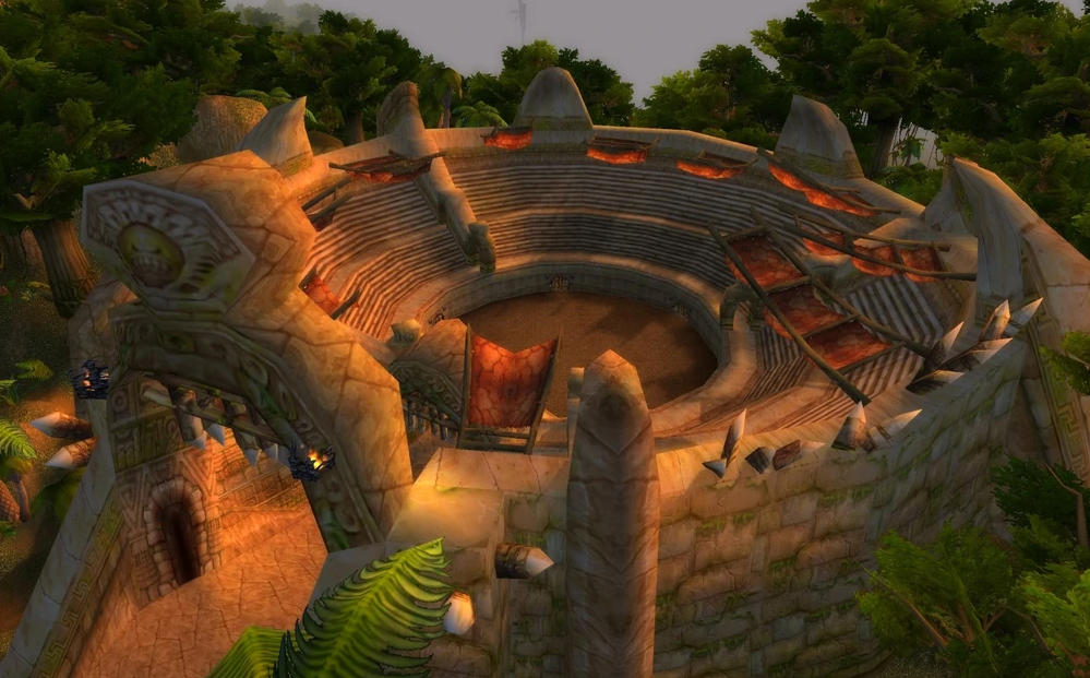 这是在荆棘谷为数不多的几个你可以参观的地方之一,而且不会马上被抓起来杀掉。古老的古拉巴什巨魔在许多年前建造了一个巨大的角斗场,现在它变成了废墟——尽管剩下的古拉巴什巨魔仍然会在角斗场内举行比赛。有些参与者是志愿者,有些是被其他巨魔部落卖到竞技场的旅行者或冒险家。著名的角斗士是非常受欢迎的,和很多参与者一样,你可以在这场豪赌中赢得和失去(包括一个人的生命)很多、很多。