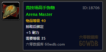 [竞技场高手饰物]和[竞技场大师饰物]都是拾取绑定的,高手饰物需要35级才能使用。