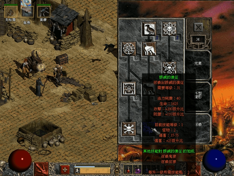 第一级就有1625的生命(当然是拥有了5级鬼魂狼和7级狂狼的加成),这样的生命力应该算得上好肉盾。有趣的是,狗熊的外观已经变成了毁灭的仆从,不过没有眩晕和击退效果,但是这一次我们可以同时召唤两只“狗熊”。而且狗熊可以和狼群共存,这样一来德鲁伊可就比原版强大多了。