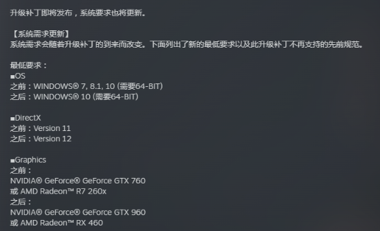 本次升级之后将不再支持DX11,转为DX12,这自然需要更高的显卡支持。所以显卡的最低要求也由之前的GTX 760和R7 260X升级为GTX 960和RX 460。这也意味着此前刚满足最低配置需求的玩家在本次升级之后将无法运行游戏,目前本次升级发布具体时间尚未公布。