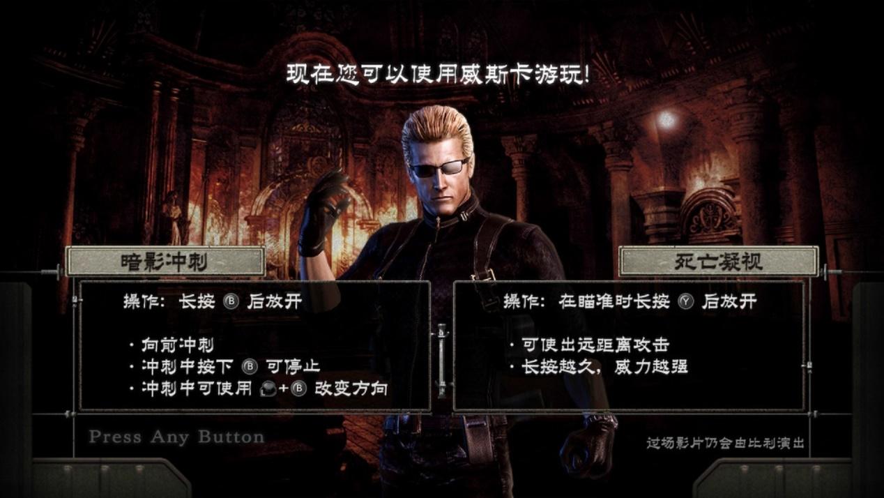 第一次通关之后,玩家就可以选择威斯克模式进行游戏。本模式不改变任何剧情,仅仅是用威斯克替换了比利,不过威斯克有两种特有的攻击方式——镭射眼与冲刺攻击。玩过《生化危机5》的玩家应该都还记得威斯克的冲刺攻击,这在佣兵模式中是节省时间的利器,而镭射眼是本作中独创的一种攻击方式,玩家只需要控制威斯克进行几秒钟的蓄力,就能发动面前小范围内的强力攻击,其威力与攻击范围都比霰弹枪更强。