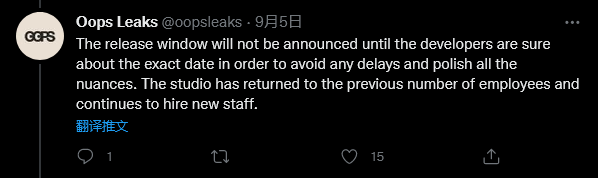 官方没有想要尽快发布这款游戏。工作室和发行商都非常注重游戏的最终质量。根据 T2 的报道,游戏应该会在 2024 年底前发布。目前工作室已经恢复到了以前的员工人数,并且还在继续招聘新员工。