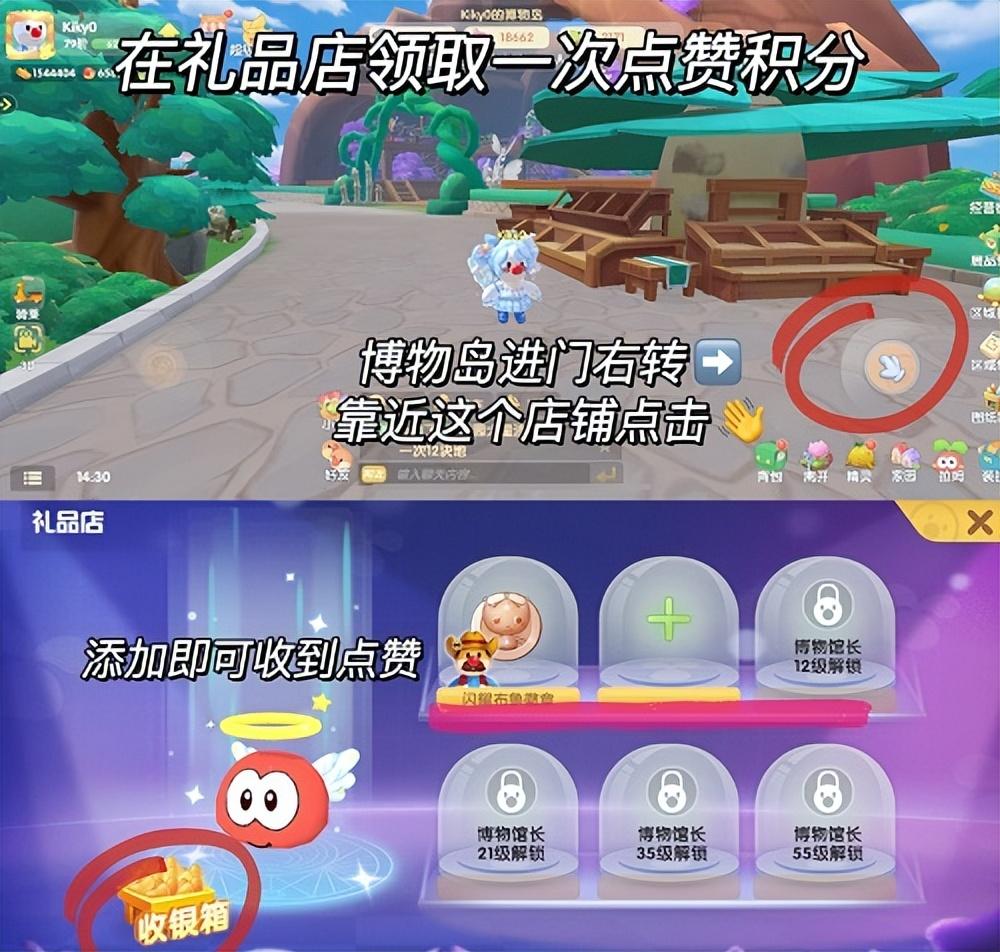 2、博物岛进门右转,靠近蓝绿色店铺点击。