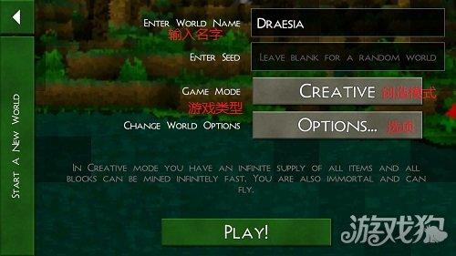 点击进入新世界后,就会出现这个界面,第一行是输入世界的名字,以便玩家存档,第三行是游戏的类型,这一个是 CREATIVE 创造模式。
