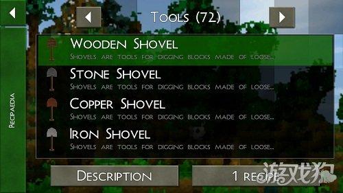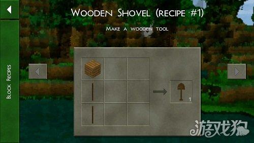 好了,这就可以找到所有的工具合成方法了,还有游戏中会出现的物品,都会有详细的解释和说明了。选中木锹,然后点击右下角的1 RECIP按键就可以出现木锹的合成方式了。