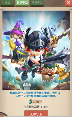 一关之后又一关,塔防之后是何物,塔防骑士团无尽守卫模式征集塔防强者在无尽的挑战中验证自己,在无尽的试炼中成就自我。 无尽守卫模式火力全开已经就绪。无尽守卫模式在玩家达到6级时开启,玩家每天可以参加2次无尽守卫模式哦,每次需要消耗10体力。点击“守卫”选择“无尽守卫”即可。总共40波的怪物对玩家的战力要求会更高,所以在战斗时英雄与机关的搭配,辅佐全体技能的释放才能击败更多的怪物。