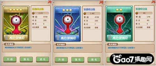 注视者之眼,这个机关造型挺拉风的,看上去有点小恐怖又带点萌萌哒。特别是品质每突破一次就要换个小造型,瞧瞧几个造型先。俺现在最高的也就只有个4星的,不知道5星的会是什么样~4星的注视者之眼头上竟然有2只角,让我不由自主的哼起“我头上有个小犄角,我身后有尾巴”~可惜它木有尾巴。