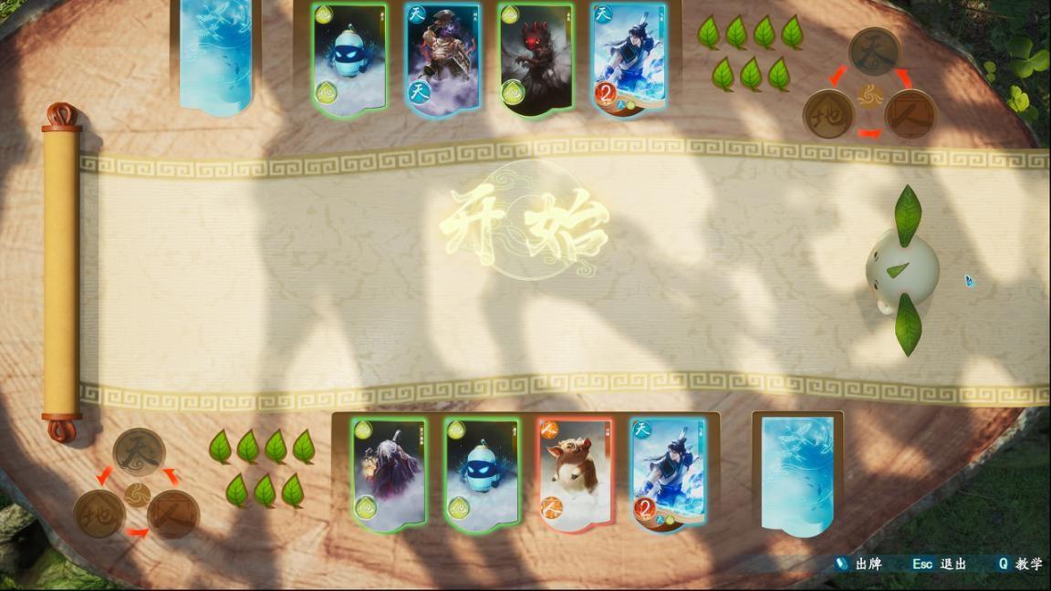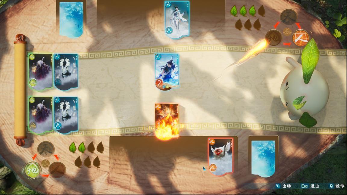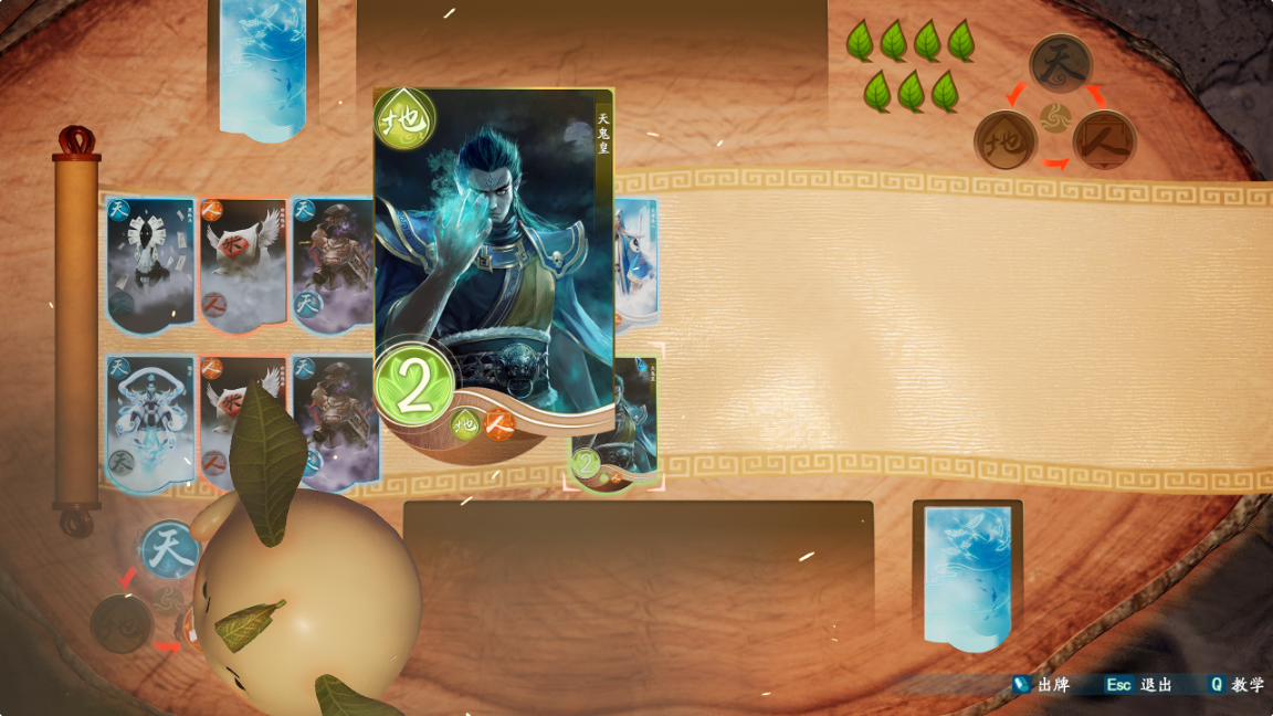 根据这个基础我们就能轻易看出AI出牌的顺序以这个牌局为例,对方起手2张天牌,2张地牌。AI的出牌逻辑是先出没技能的牌,然后依次打出3种能量。所以AI其实能打的是2张地牌和1张天牌,而天地游的机制是相同的牌累计在牌组左侧一起计算伤害。所以此时我们出地牌和他打成平手,AI下一张就会出天牌来凑天地人能量,我们再出人牌克制稳定扣AI2片叶子。