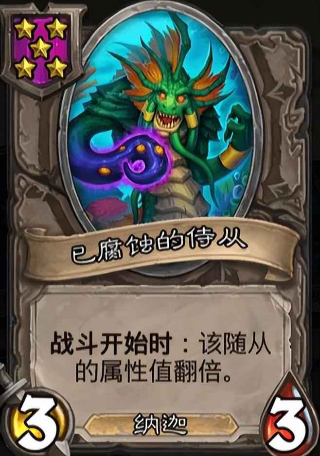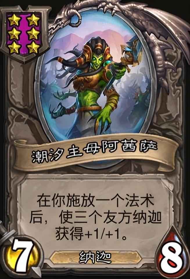 娜迦体系核心是主母,建议养的随从前期是熔岩潜伏者和日暮蛮兵,后期有了翻倍属性的娜迦后BUFF全加它身上,如果有小动物的配合,瞬间造出个大哥,非常厉害。