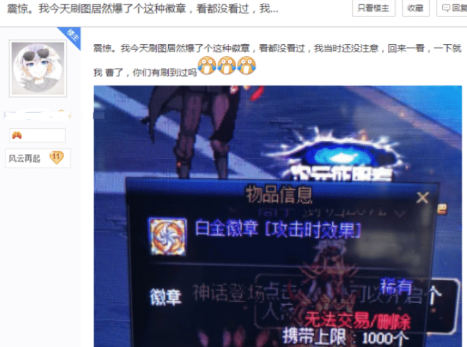 这不就有玩家刷图的时候竟然意外爆出了个特殊的白金徽章,这个白金徽章这名玩家还是第一次见到,难道这就是传说中的隐藏白金徽章吗?一开始爆出这个白金徽章的时候这名玩家还没有在意,以为就是个普通的白金徽章,但看到这个白金徽章的属性之后,这名玩家也是被彻底震惊到了。