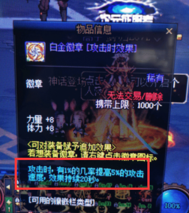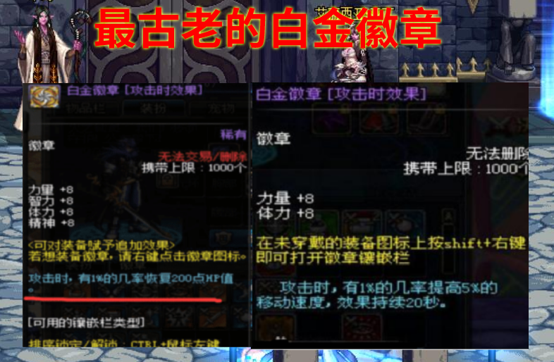 而其实这个白金徽章是dnf最古老的一批白金徽章,现在还知道这个白金徽章存在的玩家无一不是骨灰级老玩家。除了加攻速的白金徽章之外,还有增加移速和恢复血量的白金徽章。其中增加移速的白金徽章真的是搬砖神器,带上这个白金徽章搬砖的话,那是跑的非常的快,效率都能提升不少。