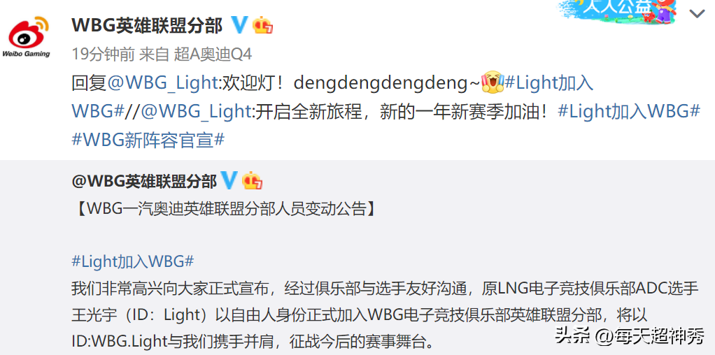 备战2023LPL春季赛,现身社交平台的WBG官博写道:经过战队和选手的友好沟通,前LNG主力ADC灯皇Light正式加盟WBG战队,与队伍一起迎接崭新的S13赛季,披挂上阵,灯皇Light崭露锋芒,不改初心,一心追逐永恒,再次欢迎Light成为WBG英雄联盟分部的一员,希望和Light携手前行,乘帆起航,感谢粉丝们对灯皇Light和WBG战队的支持。