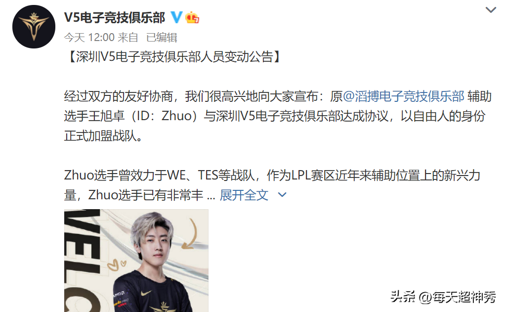 另一边V5在送走LOL世界冠军中单Rookie后,发文欢迎前TES辅助Zhuo进队:非常高兴地告诉大家,前TES辅助Zhuo顺利加盟V5战队,他是LPL辅助位置的新生代选手,有着出色的对线能力和敏锐的支援意识,期待小Zhuo为V5战队注入新的活力!