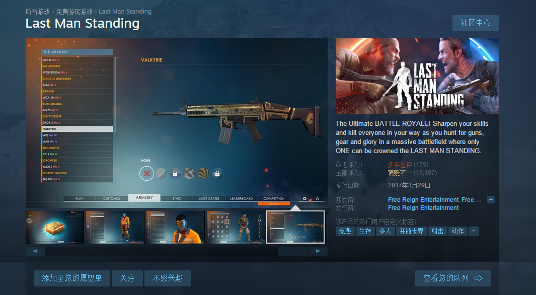 《Last Man Standing》这款游戏是在去年三月份上架Steam平台的,当时才出来那会刚好是《H1Z1》风头正劲的日子,所以大家对于这款游戏几乎都是“模仿”、“抄袭”一类的评价。但是因为游戏免费的原因,不少玩家就抱着试一试的心态玩上了这款游戏,结果大家惊人的发现《Last Man Standing》不管是在优化、射击手感、枪械皮肤以及操作上都全面碾压《H1Z1》这个老大哥。