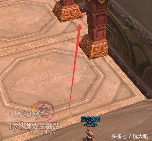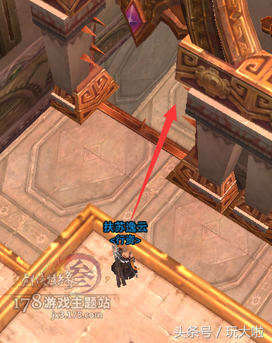 进门之后就进入了相对来说比较难的跳台子阶段,第一步我们要先用空格二段蹦到斜对面的台子上,然后钻过一个柱子和柱子之间的缝隙,就是图中红色箭头的位置: