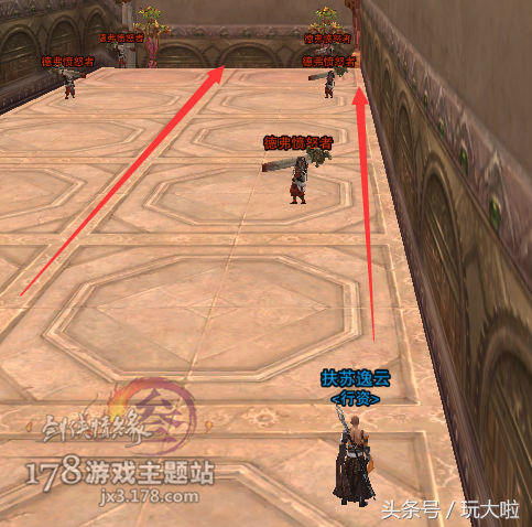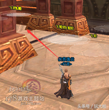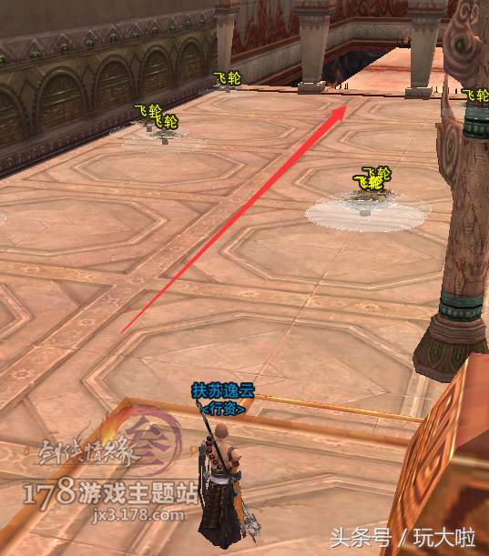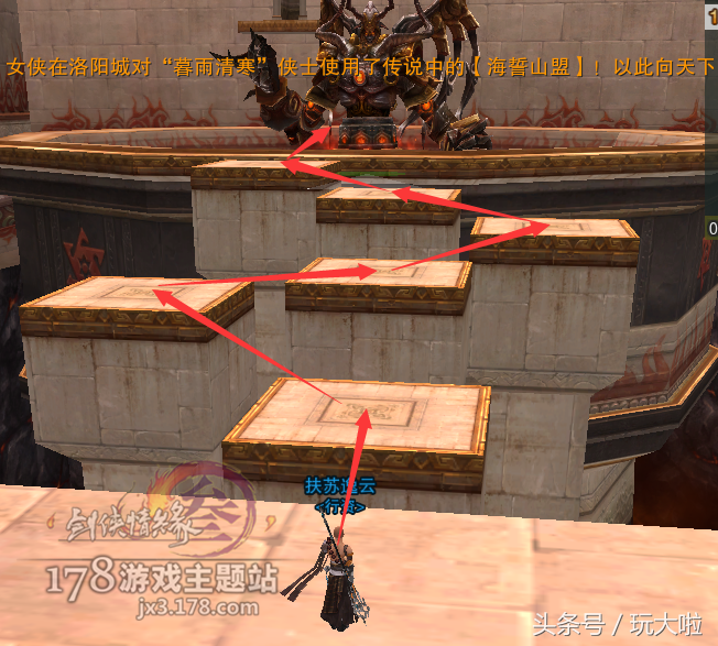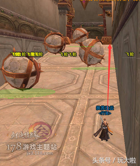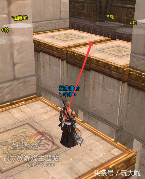 走过飞轮之后再往前走,然后右转要跳6个高台,比少林的梅花桩好跳很多,只要空格,最多接个二段即可,一路顺着箭头跳到对面即可: