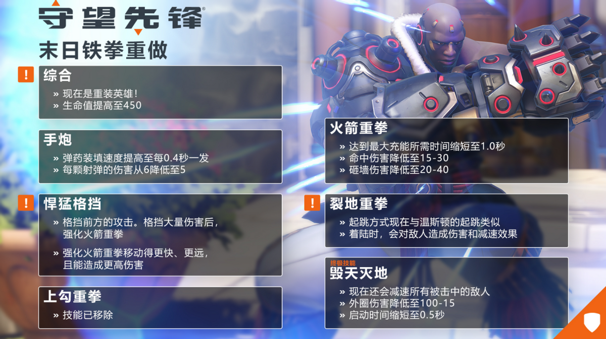 “末日铁拳的终极技能毁天灭地被赋予了新的功能,减少了施法时间。总的来说,这项技能的伤害输出已经减少,但对中心区域地面的直接打击仍然很强大。虽然新的定位和组合需要一些时间来适应,但末日铁拳已经变成了一个更容易接近、自由流动、有影响力的重英雄。