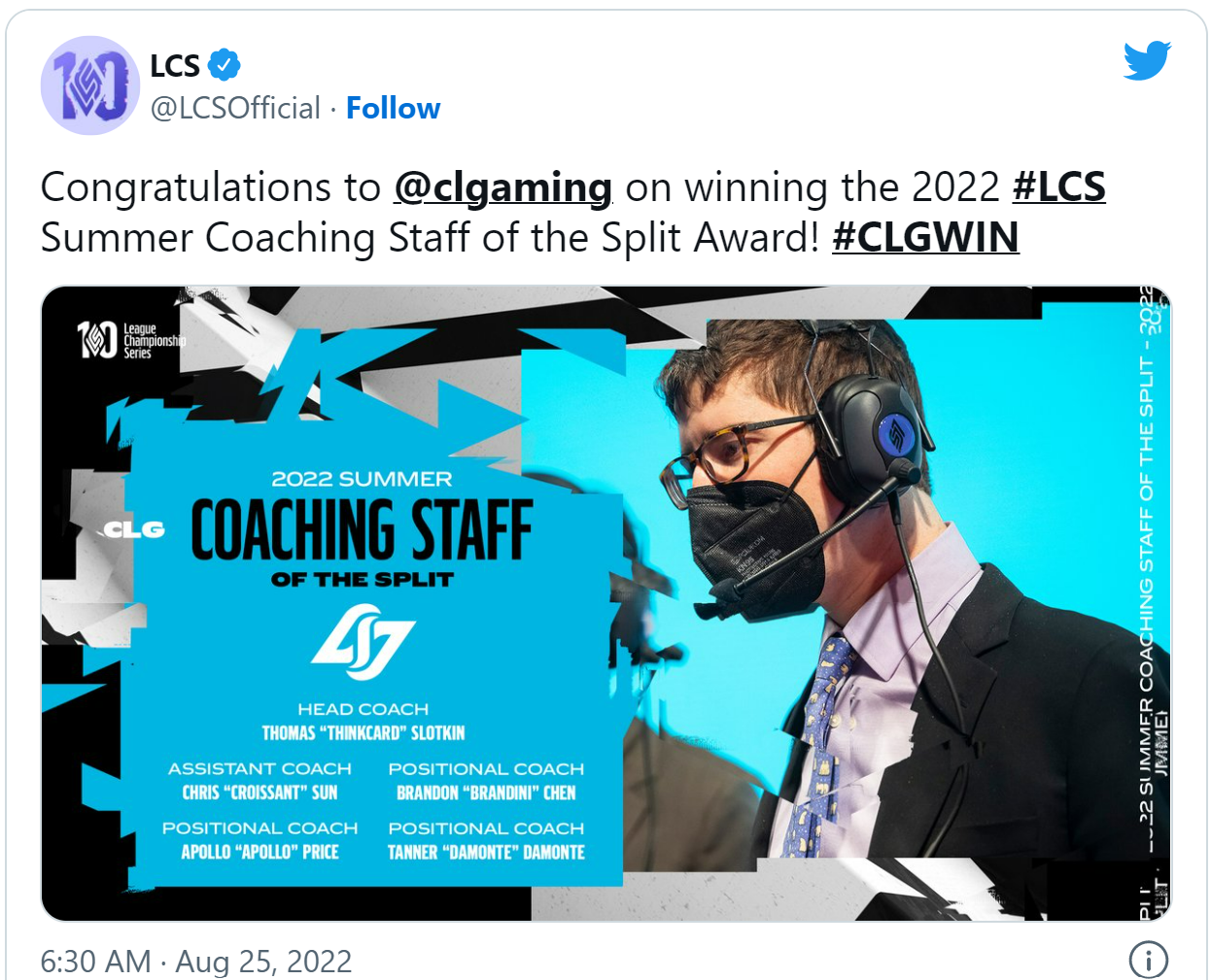 CLG获2022年北美英雄联盟夏季赛最佳教练组奖