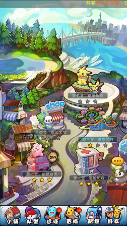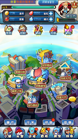 进入游戏就可看到主界面是以上帝的视角俯瞰的一座小镇。场景画面看起来还是非常生动的,宝贝球和书本造型的建筑很是有趣。不远处是一片蓝色的汪洋,偶尔还会有轮渡和帆船路过慢悠悠的路过,哪像快艇,“嗖”一下就穿过了整个屏幕~~