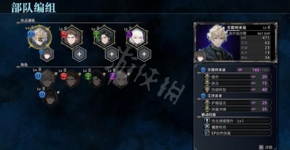 注意副官获得的经验会比直接参战的队长少,可以从图中看到将艾泽雷亚配给安德利亚兹当副官后,利亚兹多了护盾猛击、持盾冲锋技能,被动技能也会根据艾泽雷亚的技能增加。