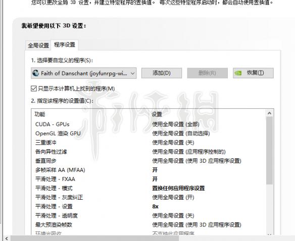 第二步,我们要做的是打开英伟达的控制面板,添加神舞幻想的程序,然后设置如下: