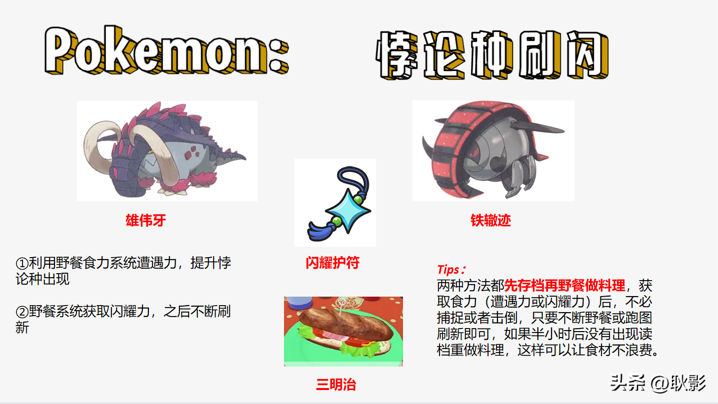 个人建议:以《宝可梦 朱》为案例,悖论种吼叫尾普遍能遇见,直接利用闪耀力可以刷,但是轰鸣月刷新较少,可以只利用遭遇力提升出现。两种方法都先存档再野餐做料理,获取食力(遭遇力或闪耀力)后,不必捕捉或者击倒,只要不断野餐或跑图刷新即可,如果半小时后没有出现读档重做料理,这样可以让食材不浪费。
