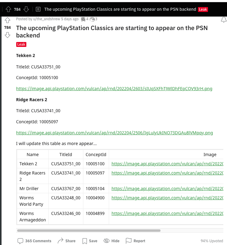 就在上个月,游机社报道过《全新PlayStation Plus将于5月开始提供超过百款游戏》。近日,该消息的后续信息被一位用户名为the_andshrew的Reddit用户进一步泄露。他表示将上架PlayStation的经典(shanggu)游戏已经在PSN的后台泄露,如下: