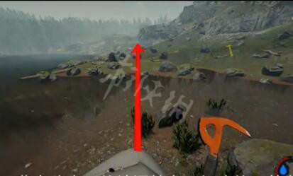 我们先跳到机头上,然后依照鼻翼尖头所指方向,即红色箭头方向望去,那条路也就是武士刀洞穴所在位置。