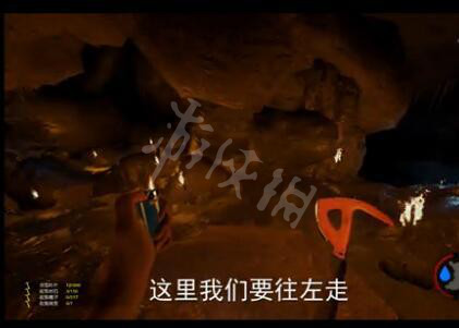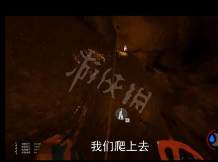 顺着绳子下来的之后,实际游戏里没有光源,建议玩家们点着布匹进行移动。就这里为了让玩家更好的了解走向及位置所以点燃了火把,提前挂在洞穴里。然后径直前走会看到一条绳子,顺着绳子往上爬即可。