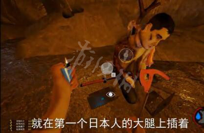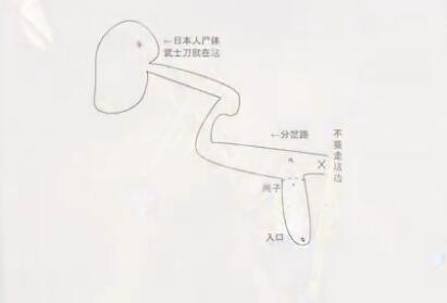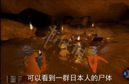 进入了另一个空旷的洞穴,这时顺着向右方走去,会是看到有一群日本人尸体,其中跪着的那位右侧身上插着的就是武士刀。